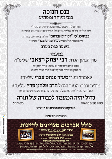 דרשת מרן הגאון רבינו יצחק רצאבי שליט"א - פוסק עדת תימן, שנמסרה במסגרת "כנס חנוכה" שנערכה ע"י עמותת "הוד שבחסד" ביום שלישי בערב - ליל נר שלישי - כ"ו כסלו ה'תשע"ט, בבית הכנסת "זכור לאברהם" רח' הרב גמליאל 1 גדרה. יישר כוח למארגן ראש הכולל הרב ליאור צברי שליט"א. שאלות ותשובות בענייני חנוכה - לאחר הדרשה.