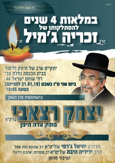 נציב החודש! אם רצונך שזכות לימוד התורה, המסורת והמנהגים, של אלפי לומדים באתר זה יעמדו לזכותך במשך חודש ימים, להצלחה לרפואה או לע"נ, אנא פנה לטל': 0504140741, ובחר את החודש הרצוי עבורך. "נציב החודש" יקבל באנר מפואר בו יופיעו שמו להצלחתו, או שם קרוביו ז"ל בצירוף נר נשמה דולק, וכן בתעודת הוקרה ובברכה אישית ממרן הגאון הרב יצחק רצאבי שליט"א.