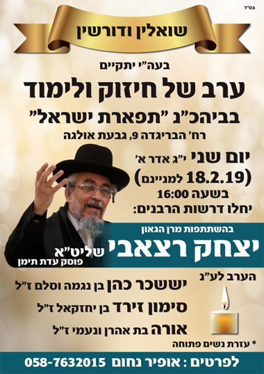 נציב החודש! אם רצונך שזכות לימוד התורה, המסורת והמנהגים, של אלפי לומדים באתר זה יעמדו לזכותך במשך חודש ימים, להצלחה לרפואה או לע"נ, אנא פנה לטל': 0504140741, ובחר את החודש הרצוי עבורך. "נציב החודש" יקבל באנר מפואר בו יופיעו שמו להצלחתו, או שם קרוביו ז"ל בצירוף נר נשמה דולק, וכן בתעודת הוקרה ובברכה אישית ממרן הגאון הרב יצחק רצאבי שליט"א.