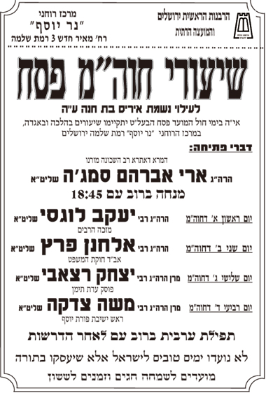 | שיעור בענייני פסח בהלכה ובאגדה מפי מרן הגאון רבי יצחק רצאבי שליט"א - פוסק עדת תימן, שנמסר ביום שלישי ג' דחול המועד פסח ה'תשע"ט, במרכז הרוחני "נר יוסף" - רמת שלמה, ירושלים עיקו"ת, בראשות הרב הגאון אברהם סמג'ה שליט"א חתנו של הראשון לציון הגאון הגדול הרב בקשי דורון שליט"א. | ||||||||