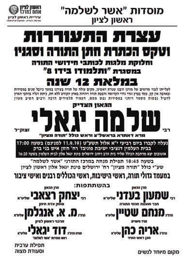 דרשת מרן הגאון רבי יצחק רצאבי שליט"א - פוסק עדת תימן, שנמסרה במסגרת "עצרת התעוררות" וטקס הכתרת חתן התורה וסגניו וחלוקת מילגות לכותבי חידושי התורה במסגרת "ותלמודו בידו 8", במלאות 12 שנים לפטירת הגאון הצדיק רבי שלמה יגאלי זצוק"ל - מרא דאתרא בראשל"צ וראש כולל "תורה מציון", והנערכת מדי שנה ע"י מוסדות "אשר לשלמה" בראשון לציון. כולל תמונות.