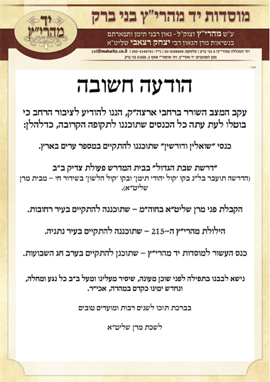 | עקב המצב השורר ברחבי ארצה"ק, הננו להודיע לציבור הרחב כי בוטלו לעת עתה כל הכנסים שתוכננו לתקופה הקרובה, כדלהלן: כנסי "שואלין ודורשין" שתוכננו להתקיים במספר ערים בארץ. "דרשת שבת הגדול" בבית המדרש פעולת צדיק ב"ב (הדרשה תועבר בל"נ בקו 'קול יהודי תימן' ובקו 'קול הלשון' בשידור חי - מבית מרן שליט"א). הקבלת פני מרן שליט"א בחוה"מ - שתוכננה להתקיים בעיר רחובות. הילולת מהרי"ץ ה-215 - שתוכננה להתקיים בעיר נתניה. כנס העשור למוסדות יד מהרי"ץ - שתוכנן להתקיים בערב חג השבועות. נישא לבבנו בתפילה לפני שוכן מעונה, שיסיר מעלינו ומעל ב"ב כל נגע ומחלה, ונחדש ימינו כקדם במהרה, אכי"ר. בברכת תזכו לשנים רבות ומועדים טובים. לשכת מרן שליט"א | ||||||||