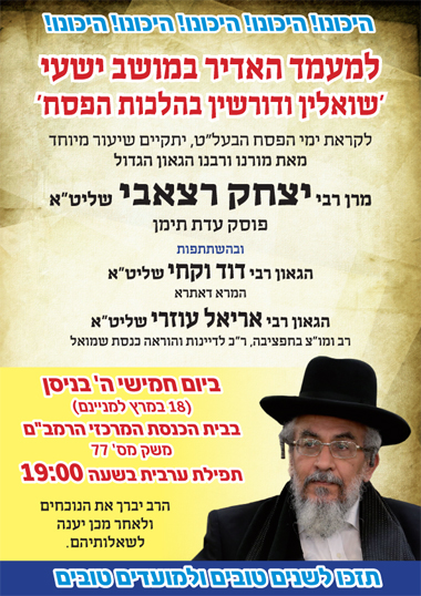 שיעור בענייני חג הפסח מפי מרן הגאון רבי יצחק רצאבי שליט"א - פוסק עדת תימן, שנמסר במסגרת מעמד "שואלין ודורשין בהלכות הפסח" בהשתתפות המרא דאתרא הגאון רבי דוד וקחי שליט"א, והגאון רבי אריאל עוזירי שליט"א - רב ומו"צ בחפציבה, ר"כ לדיינות והוראה כנסת שמואל, ביום חמישי בערב, אור לו' בניסן התשפ"א, בבית הכנסת המרכזי הרמב"ם משק מס' 77. דברי פתיחה מפי הגאון רבי אריאל עוזירי שליט"א.