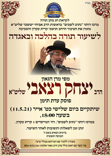 וידיאו! שיעור תורה בהלכה ובאגדה לקראת חג השבועות מפי מרן הגאון הרב יצחק רצאבי שליט"א - פוסק עדת תימן, שנמסר ביום שלישי כט' אייר התשפ"א, במרכז רוחני "נתיב לשבים", בראשות הרב אביחי יששכר שליט"א, קרית עקרון ת"ו. שאלות ותשובות לאחר השיעור.