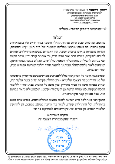 המלצת מרן שליט"א לקהילת "אחוות אחים" - חריש ת"ו