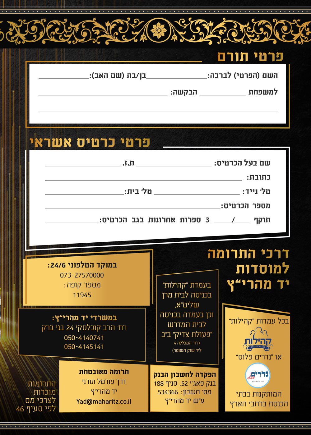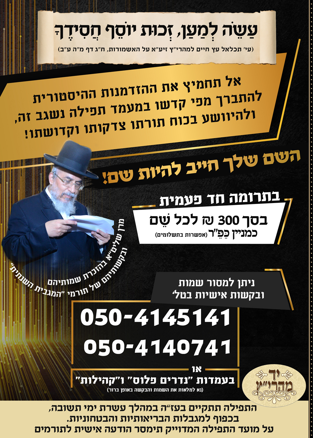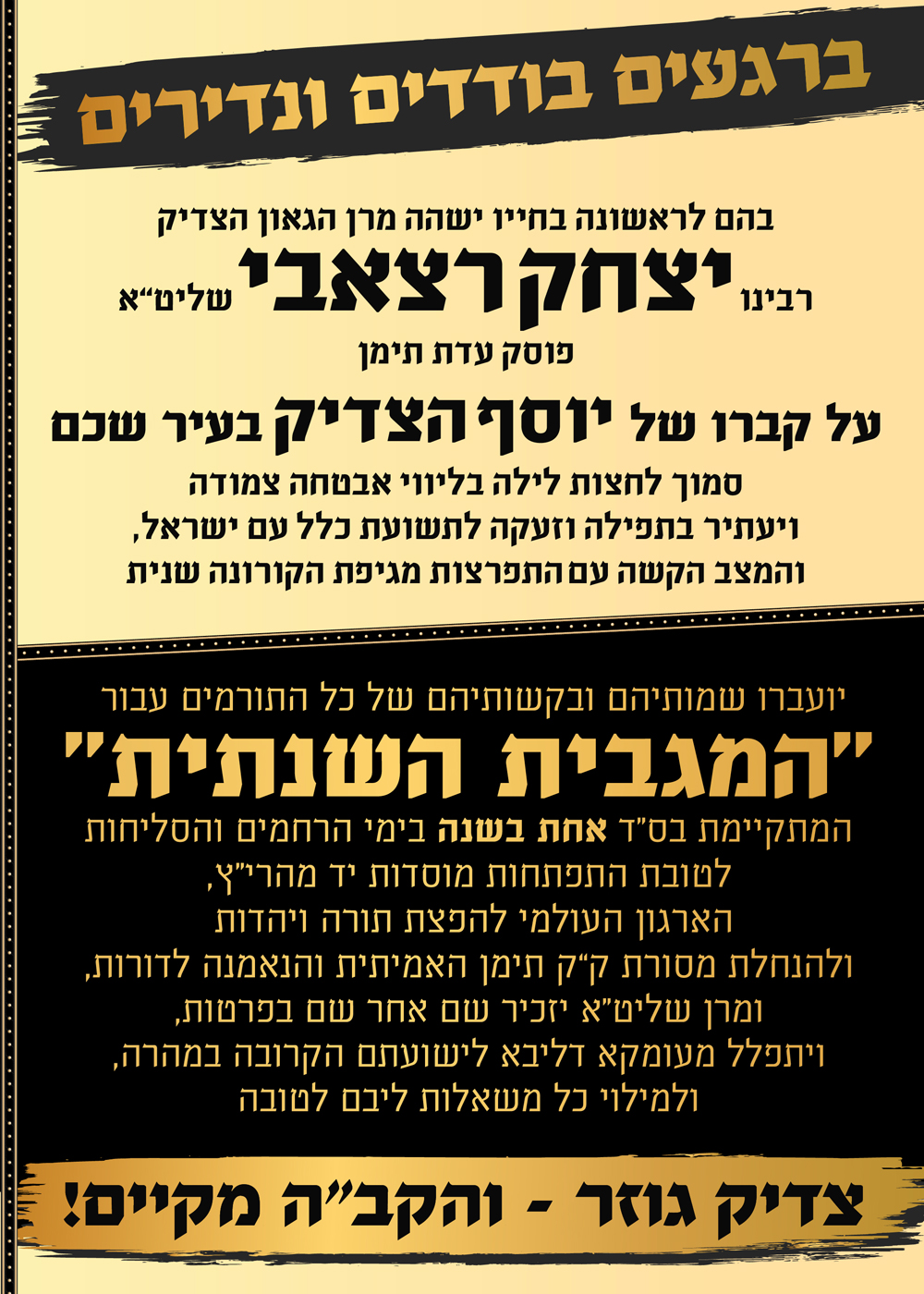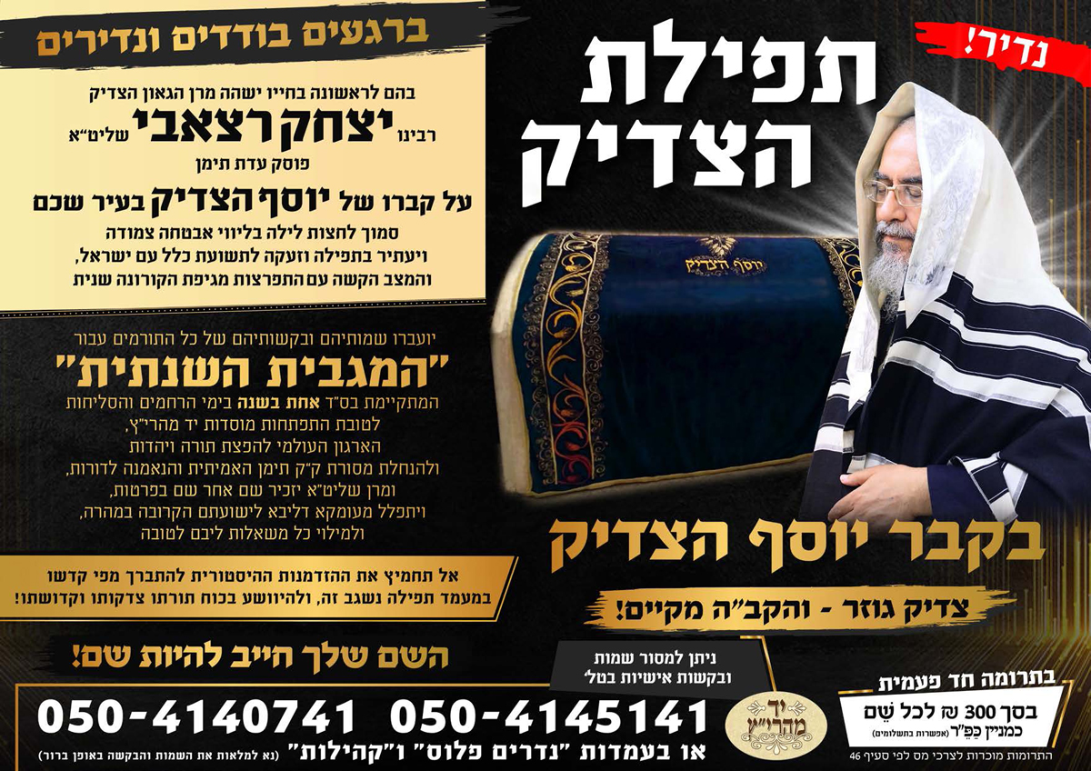 | ברגעים בודדים ונדירים, בהם לראשונה בחייו ישהה מרן הגאון הצדיק רבינו יצחק רצאבי שליט"א פוסק עדת תימן, על קברו של יוסף הצדיק בעיר שכם, סמוך לחצות לילה בליווי אבטחה צמודה, ויעתיר בתפילה וזעקה לתשועת כלל עם ישראל, והמצב הקשה עם התפרצות מגיפת הקורונה שנית, יועברו שמותיהם ובקשותיהם של כל התורמים עבור "המגבית השנתית" המתקיימת בס"ד "אחת בשנה" בימי הרחמים והסליחות לטובת התפתחות מוסדות יד מהרי"ץ, הארגון העולמי להפצת תורה ויהדות ולהנחלת מסורת ק"ק תימן האמיתית והנאמנה לדורות, ומרן שליט"א יזכיר שם אחר שם בפרטות, ויתפלל מעומקא דליבא לישועתם הקרובה במהרה, ולמילוי כל משאלות ליבם לטובה. צדיק גוזר - והקב"ה מקיים! אל תחמיץ את ההזדמנות ההיסטורית להתברך מפי קדשו במעמד תפילה נשגב זה, ולהיוושע בכוח תורתו צדקותו וחסידותו! השם שלך חייב להיות שם! עקב השהות הקצרה במקום מסיבות בטחוניות, תיתכן הגבלה במספר השמות והבקשות. הזריזים המקדימים להירשם דרך האתר יד מהרי"ץ, יבטיחו את מקומם ראשונים בהקראת שמותם ובקשותיהם ע"י מרן שליט"א בתפילה נדירה זו! | ||||||||