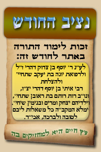 נציב החודש! אם רצונך שזכות לימוד התורה, המסורת והמנהגים, של אלפי לומדים באתר זה יעמדו לזכותך במשך חודש ימים, להצלחה לרפואה או לע"נ, אנא פנה לטל': 0504140741, ובחר את החודש הרצוי עבורך. "נציב החודש" יקבל באנר מפואר בו יופיעו שמו להצלחתו, או שם קרוביו ז"ל בצירוף נר נשמה דולק, וכן בתעודת הוקרה ובברכה אישית ממרן הגאון הרב יצחק רצאבי שליט"א.