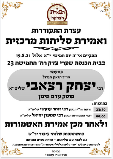 דברי חיזוק והתעוררות מפי מרן הגאון רבי יצחק רצאבי שליט"א פוסק עדת תימן, שנאמרו במסגרת "עצרת התעוררות ואמירת סליחות" בבית הכנסת "שערי ציון" פתח תקוה, יום חמישי בערב (ליל ששי) י"ב אלול התשפ"א. יישר כח למארגן הרב אורי עומיסי הי"ו מנכ"ל ארגון "תפארת הצדקה" פ"ת
