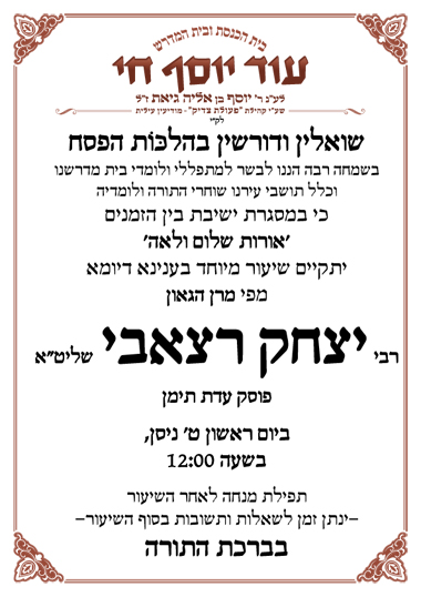 שיעור בהלכה ובאגדה לקראת חג הפסח הבעל"ט מפי מרן הגאון רבי יצחק רצאבי שליט"א - פוסק עדת תימן, שנמסר במסגרת ישיבת בין הזמנים "אורות שלום ולאה", בראשות ידידנו הרב ראובן רצאבי שליט"א, ביום ראשון ט' ניסן התשפ"ב, ביהמ"ד פעולת צדיק - קרית ספר, מודיעין עילית