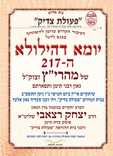 דרשה בענייני מסורת יהדות תימן, מפי מרן הגאון רבינו יצחק רצאבי שליט"א - פוסק עדת תימן, שנמסרה במסגרת הילולת מהרי"ץ ה-217, בבית המדרש "פעולת צדיק" בעיר אלעד ת"ו, בראשות בנו הרה"ג משה רצאבי שליט"א - רב הקהילה, אור לכ"ח ניסן התשפ"ב.