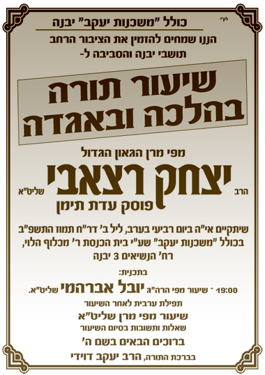 | הננו מתכבדים להזמין את הציבור הרחב תושבי יבנה והסביבה ל- שיעור תורה בהלכה ובאגדה מפי מרן הגאון רבינו יצחק רצאבי שליט"א - פוסק עדת תימן, שיתקיים אי"ה ביום רביעי בערב, ליל ב' דר"ח תמוז התשפ"ב, בכולל "משכנות יעקב" שע"י בית הכנסת ר' מכלוף הלוי, רחוב הנשיאים 3 יבנה. פרטים במודעה המצ"ב. ברוכים הבאים בשם ה'. | ||||||||
