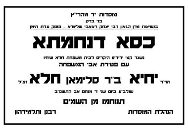 | מספד מר מפי מרן הגאון רבינו יצחק רצאבי שליט"א - פוסק עדת תימן, שנאמר בהלווית הר"ר יחיא חלא ב"ר סלימאן זצ"ל, יום שני ד' מנחם אב התשפ"ב, ראש העין ת"ו. כסא דנחמתא נשגר קמי ידידינו היקרים לבית משפחת חלא שיחיו, מן השמים תנוחמו. | ||||||||