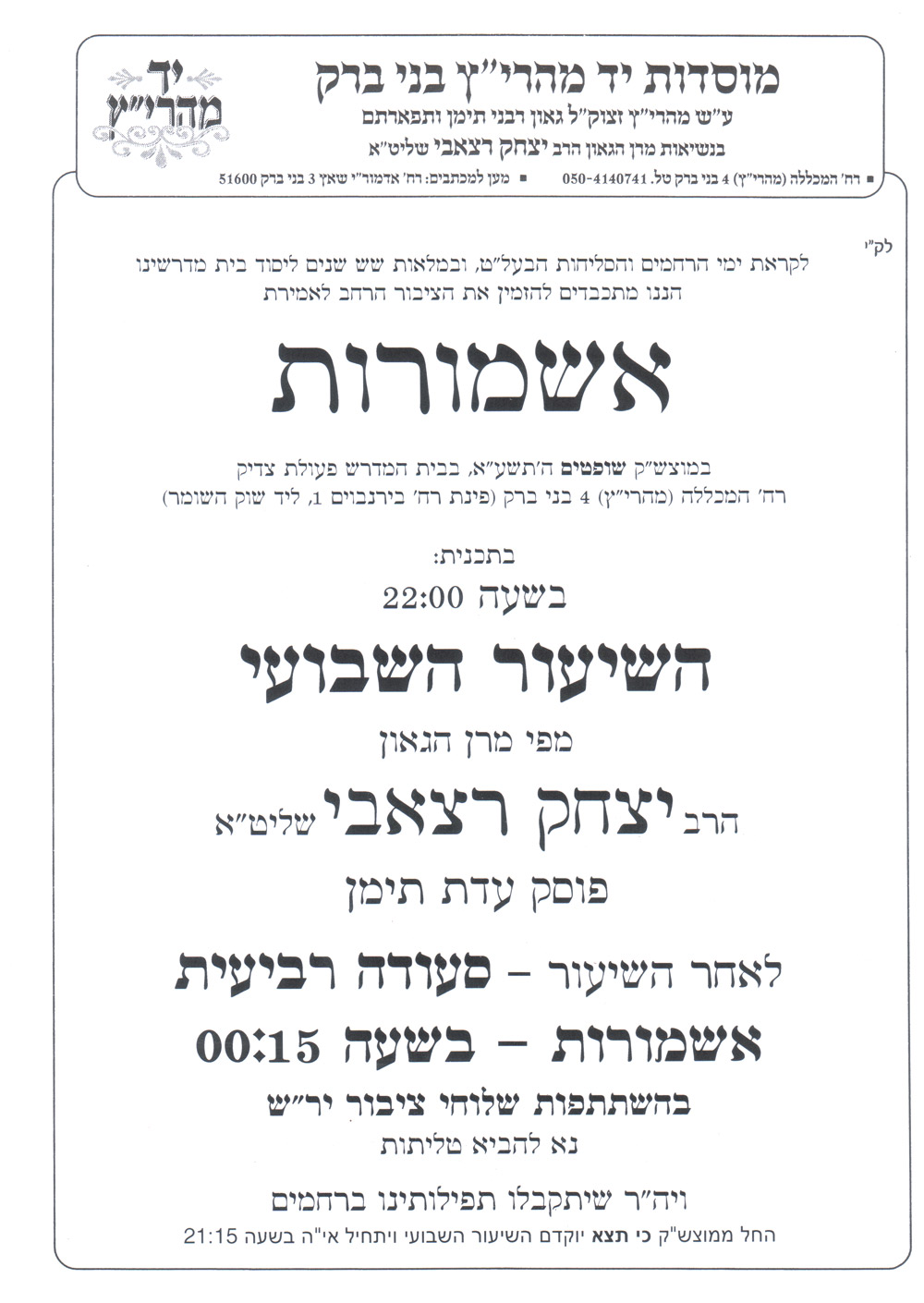 נציב החודש! אם רצונך שזכות לימוד התורה, המסורת והמנהגים, של אלפי לומדים באתר זה יעמדו לזכותך במשך חודש ימים, להצלחה לרפואה או לע"נ, אנא פנה לטל': 0504140741, ובחר את החודש הרצוי עבורך. "נציב החודש" יקבל באנר מפואר בו יופיעו שמו להצלחתו, או שם קרוביו ז"ל בצירוף נר נשמה דולק, וכן בתעודת הוקרה ובברכה אישית ממרן הגאון הרב יצחק רצאבי שליט"א.