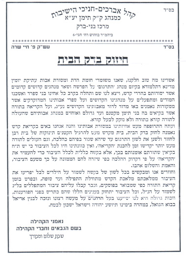 | מצ"ב מנשר שפורסם ע"י גבאי קהילת אברכים חניכי הישיבות - מרכז בני ברק, לציבור האברכים המתפללים בבית כנסת זו, ובו קריאה לציבור לחזק את בדק הבית בקריאת התורה והתרגום כפי מסורת ומנהגי יהדות תימן. ירבו כמותם בישראל. | ||||||||