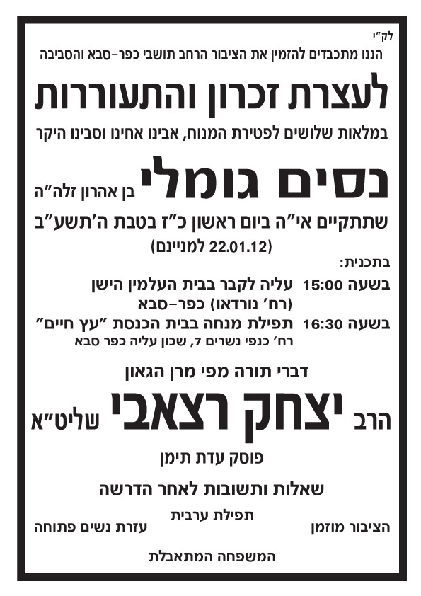 | במסגרת עצרת זכרון והתעוררות במלאות שלושים לפטירת ר' נסים בן אהרון גומלי זלה"ה. כולל שאלות ותשובות | ||||||||