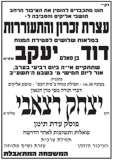 | במסגרת עצרת זכרון והתעוררות במלאות שלושים לפטירת ר' דוד בן סאלם יעקב זלה"ה. אביו של הרה"ג אבשלום יעקב שליט"א מו"צ בבית ההוראה וברכסים. כולל שאלות ותשובות | ||||||||