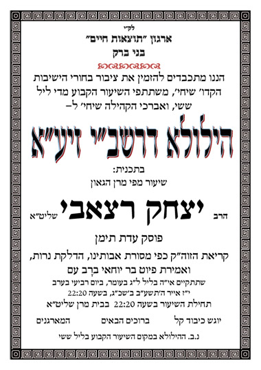 על פי הוראת מרן הגאון הרב יצחק רצאבי שליט"א וגדולי התורה והפוסקים, השימוש באינטרנט הינו לצורך בלבד, ובחיבור לאינטרנט כשר ומבוקר. כל חיבור אחר מהוה סכנה רוחנית וחינוכית.