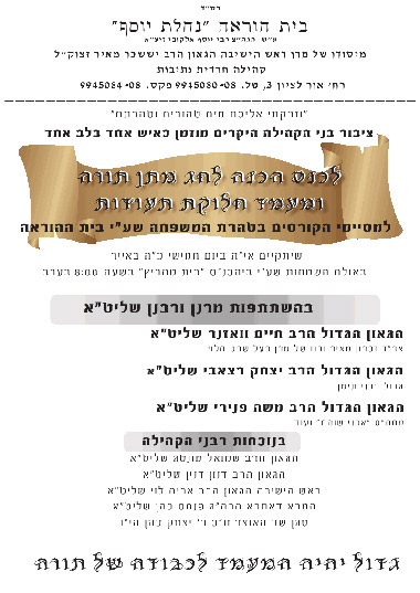 בית הוראה "נחלת יוסף" מיסודו של ראש הישיבה הגאון הרב יששכר מאיר זצוק"ל - הקהילה החרדית בנתיבות, מזמין את ציבור בני הקהילה לכנס הכנה לחג מתן תורה ומעמד חלוקת תעודות למסיימי הקורסים בטהרת המשפחה, שיתקיים אי"ה ביום חמישי בערב כ"ה באייר התשע"ב באולם שע"י ביהכ"נ "בית מהרי"ץ" נתיבות.