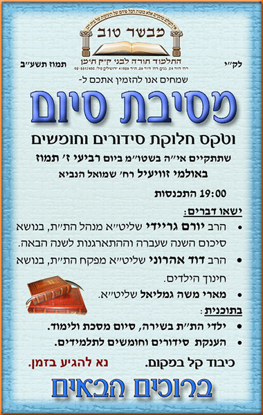 הציבור מוזמן למסיבת סיום לשנת הלימודים ה'תשע"ב, של ילדי ת"ת מבשר טוב בירושלם בנשיאות מרן הגאון הרב יצחק רצאבי שליט"א. בתוכנית: דברי תורה, טקס חלוקת סידורים וחומשים וכן שירה קדושה מפי ילדי הת"ת. המסיבה תתקיים היום באולמי זוויעיל רח' שמואל הנביא...