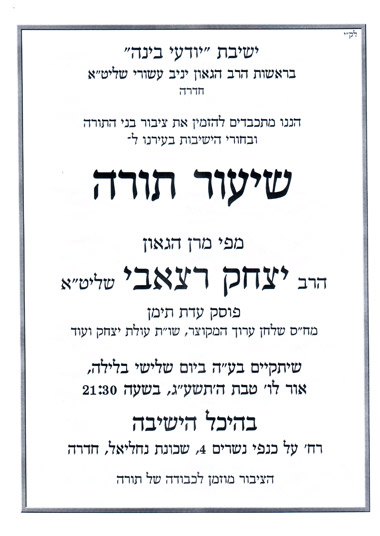 על פי הוראת מרן הגאון הרב יצחק רצאבי שליט"א וגדולי התורה והפוסקים, השימוש באינטרנט הינו לצורך בלבד, ובחיבור לאינטרנט כשר ומבוקר. כל חיבור אחר מהוה סכנה רוחנית וחינוכית.