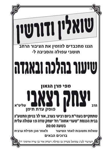 על פי הוראת מרן הגאון הרב יצחק רצאבי שליט"א וגדולי התורה והפוסקים, השימוש באינטרנט הינו לצורך בלבד, ובחיבור לאינטרנט כשר ומבוקר. כל חיבור אחר מהוה סכנה רוחנית וחינוכית.