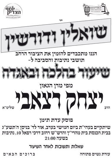 דרשת מרן הגאון הרב יצחק רצאבי שליט"א במסגרת שואלין ודורשין בהלכות פסח, שנמסרה ביום חמישי בערב אור לד' ניסן ה'תשע"ג, בבית הכנסת "בית מהרי"ץ והרש"ש" - נתיבות. כולל שאלות ותשובות לאחר השיעור. יישר כח למארגן הרב יוסף חיים קשת יצ"ו.