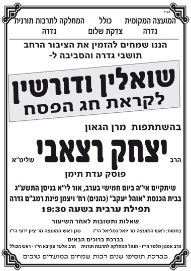 "שואלין ודורשין" בהלכות פסח התשע"ג - גדרה 6 תמונות 60:00 דקות |