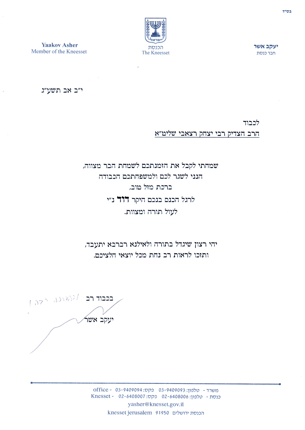 ברכת חכ"י דגל התורה למרן שליט"א לרגל שמחת הבר מצווה לבן זקונים ה"ה דוד נ"י |