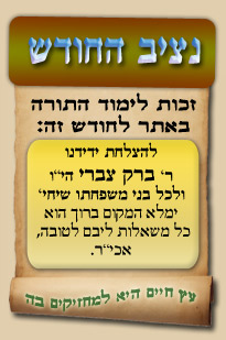 נציב החודש! אם רצונך שזכות לימוד התורה, המסורת והמנהגים, של אלפי לומדים באתר זה יעמדו לזכותך במשך חודש ימים, להצלחה לרפואה או לע"נ, אנא פנה לטל': 0504140741, ובחר את החודש הרצוי עבורך. "נציב החודש" יקבל באנר מפואר בו יופיעו שמו להצלחתו, או שם קרוביו ז"ל בצירוף נר נשמה דולק, וכן בתעודת הוקרה ובברכה אישית ממרן הגאון הרב יצחק רצאבי שליט"א.