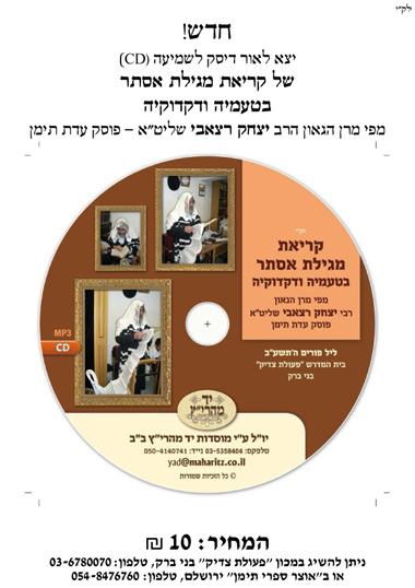 יצא לאור בס"ד דיסק לשמיעה (CD) של קריאת "מגילת אסתר" בטעמיה ודקדוקיה, מפי מרן הגאון הרב יצחק רצאבי שליט"א - פוסק עדת תימן, שנקראה בליל פורים ה'תשע"ב בבית המדרש "פעולת צדיק" בני ברק. ניתן להשיג במכון "פעולת צדיק" בני ברק, טל': 03-6780070, וכן בחנות התורנית "אוצר ספרי תימן" ירושלים, טל' 054-8476760. ה"מנויים לחיים" יקבלו את הדיסק כשי לביתם דרך הדואר, במשלוח הבא של חוברות שיעורי מרן שליט"א.