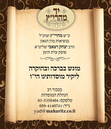 על פי הוראת מרן הגאון הרב יצחק רצאבי שליט"א וגדולי התורה והפוסקים, השימוש באינטרנט הינו לצורך בלבד, ובחיבור לאינטרנט כשר ומבוקר. כל חיבור אחר מהוה סכנה רוחנית וחינוכית.