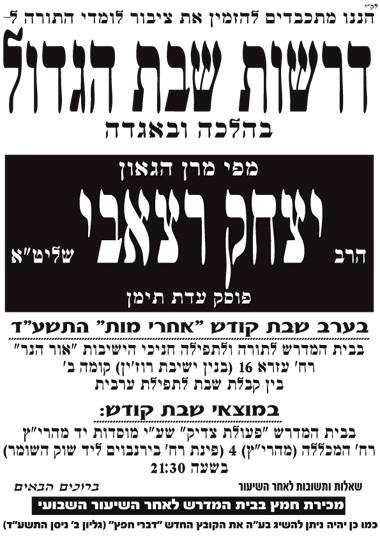 על פי הוראת מרן הגאון הרב יצחק רצאבי שליט"א וגדולי התורה והפוסקים, השימוש באינטרנט הינו לצורך בלבד, ובחיבור לאינטרנט כשר ומבוקר. כל חיבור אחר מהוה סכנה רוחנית וחינוכית.