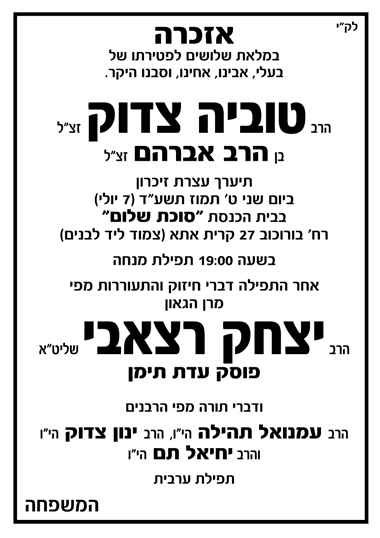 | שנמסרה במסגרת "עצרת זכרון" במלאות שלושים לפטירת הרב טוביה בן אברהם צדוק זצ"ל, שהתקיימה ביום שני בערב ט' בתמוז ה'תשע"ד, בבית הכנסת "סוכת שלום" - קרית אתא. יישר כח למארגן הרב אבישי חבשוש הי"ו. | ||||||||