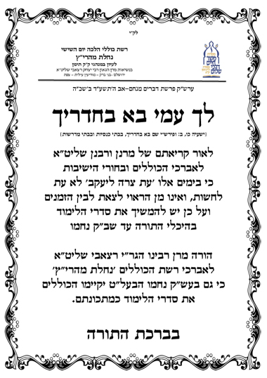 | לאור קריאתם של מרן ורבנן שליט"א לאברכי הכוללים ולבחורי הישיבות, כי בימים אלו 'עת צרה היא ליעקב' לא עת לחשות, ואין מן הראוי לצאת ל"בין הזמנים", ועל כן יש להמשיך את סדר הלימוד בהיכלי התורה עד שב"ק נחמו, הורה מרן רבינו הגר"י רצאבי שליט"א לאברכי רשת בכוללים נחלת מהרי"ץ... | ||||||||