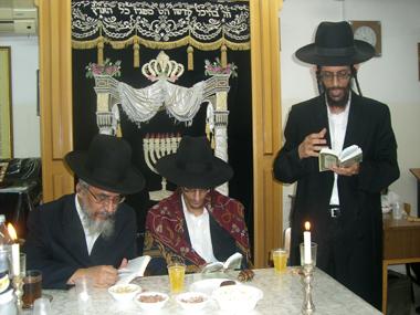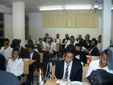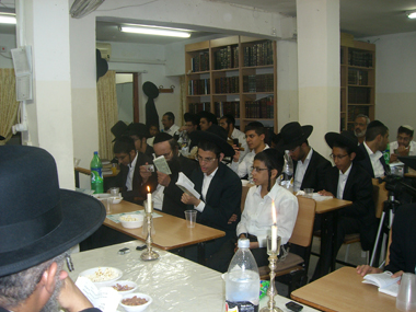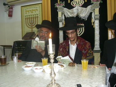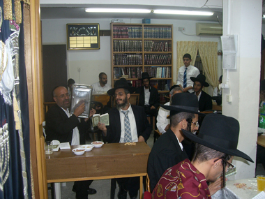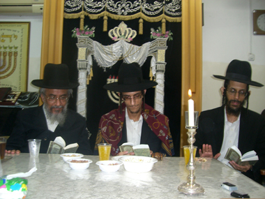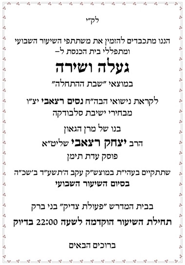 | געלה ושירת קודש שנערכה במוצאי "שבת ההתחלה" לבחה"ח נסים רצאבי יצ"ו מבחירי ישיבת סלבודקה, בנו של מרן הגאון הרב יצחק רצאבי שליט"א - פוסק עדת תימן. כולל: הלבשת החתן, שירה מתוך דיואן "נעימות שיר", דברי תורה מפי הרה"ג משה רצאבי שליט"א, וברכה אחרונה. מוצש"ק עקב התשע"ד בבית המדרש "פעולת צדיק" בני ברק. |