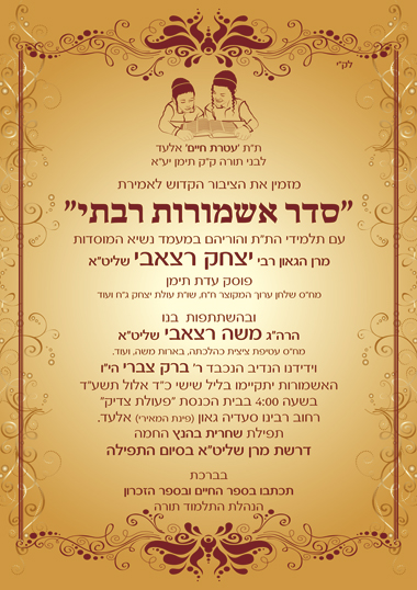 | אמירת "אשמורות" עם ילדי תלמוד תורה "עטרת חיים" לבני ק"ק תימן בעיר אלעד, במעמד נשיא המוסדות מרן הגאון רבי יצחק רצאבי שליט"א, ובהשתתפות בנו הרה"ג משה רצאבי שליט"א רב קהילת "פעולת צדיק" - אלעד. ליל ששי כ"ד אלול ה'תשע"ד בשעה 4:00 לפנות בוקר, בבית הכנסת "פעולת צדיק" רח' רבינו סעדיה גאון (פינת המאירי) אלעד. תפילת שחרית בהנץ החמה. דרשת מרן שליט"א בסיום התפילה. |