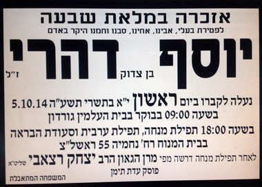 | שנמסרה במסגרת עצרת התעוררות במלאות שבעה לפטירת המנוח ר' יוסף בן צדוק דהרי ז"ל, שנערכה ביום י"א תשרי ה'תשע"ה בבית המנוח - ראשון לציון. כולל שאלות ותשובות לאחר הדרשה. יישר כוח גדול לבנו ה"ה הרב איתי דהרי הי"ו - בן המנוח, על כל פועליו הרבים למען הפצת תורתו של מרן שליט"א בארץ ובעולם. |