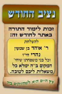 נציב החודש! אם רצונך שזכות לימוד התורה, המסורת והמנהגים, של אלפי לומדים באתר זה יעמדו לזכותך במשך חודש ימים, להצלחה לרפואה או לע"נ, אנא פנה לטל': 0504140741, ובחר את החודש הרצוי עבורך. "נציב החודש" יקבל באנר מפואר בו יופיעו שמו להצלחתו, או שם קרוביו ז"ל בצירוף נר נשמה דולק, וכן בתעודת הוקרה ובברכה אישית ממרן הגאון הרב יצחק רצאבי שליט"א.