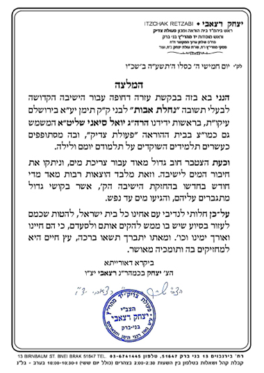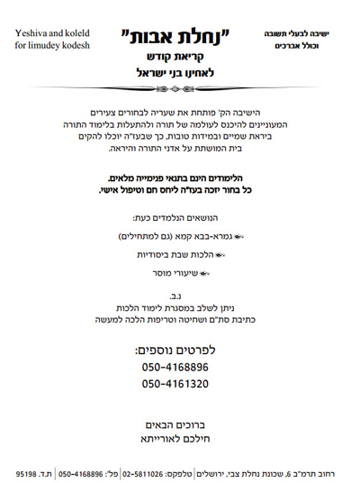 נציב החודש! אם רצונך שזכות לימוד התורה, המסורת והמנהגים, של אלפי לומדים באתר זה יעמדו לזכותך במשך חודש ימים, להצלחה לרפואה או לע"נ, אנא פנה לטל': 0504140741, ובחר את החודש הרצוי עבורך. "נציב החודש" יקבל באנר מפואר בו יופיעו שמו להצלחתו, או שם קרוביו ז"ל בצירוף נר נשמה דולק, וכן בתעודת הוקרה ובברכה אישית ממרן הגאון הרב יצחק רצאבי שליט"א.