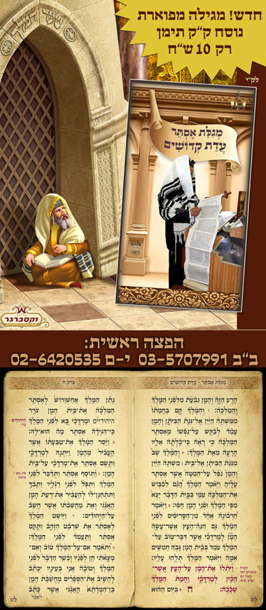 ארגון "אור ההלכה" שמח לבשר כי בס"ד יצא לאור מגילת אסתר "עדת קדושים" בנוסח ק"ק תימן יע"א, מגילה מדוייקת מהודרת ומעוטרת ע"ג נייר כרומו מרהיב עם פרטי כל הלכות מקרא מגילה בשילוב תמונות, כולל שירים וברכת המזון לפורים, עיצוב הכריכה "וקסברגר", דברי ברכה מאת מרן הגאון רבי יצחק רצאבי שליט"א...