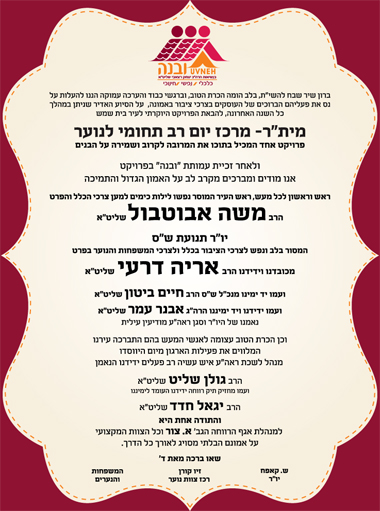 ארגון "ובנה" בנשיאות מרן הגאון רבי יצחק רצאבי שליט"א, ובניהולה של מרת ש. קאפח שתחי', זכה במכרז היוקרתי של משרד הרווחה, להפעלת מרכז יום רב תחומי לנוער בעיר בית שמש. הפרויקט יהווה הצלה לבחורים המתקשים להתמודד במסגרת ישיבתית נורמטיבית, תוך שמירה על צביונם. לאחר למעלה משנה, של מאמצי על של ראש העיר ומנהלת אגף הרווחה, הקצה משרד הרווחה תקציב נכבד להפעלת מסגרת יום ארוך לנוער בעיר בית שמש. ביום חמישי נערך המכרז, וארגון ובנה זכה בפרויקט- כאשר הארגון מצידו התחייב להשקיע עוד מאות אלפי שקלים בשנה להצלחתו. בארגון ובנה, מברכים על הזכיה במית"ר ומודעים לגודל האחריות שהוטלה על כתפם. פרויקט מית"ר- יחל לפעול מיד לאחר הפסח, במתחם ענק, לבני נוער בגילאי 12-18. במקום תפתח מסגרת לימודית לעשרות נערים חרדים- אשר תכלול מתחם בית מדרש, יחד עם חדרי למידה, מחשבים, חדר כושר, משחקים ועוד. רב בית המדרש ילווה את המקום באופן רצוף, יחד עם אנשי מקצוע מהשורה הראשונה. בארגון בטוחים כי המקום יהווה הצלה של ממש לנערים אשר מתקשים להשתלב במסגרת ישיבתית נורמטיבית, אך מעוניינים לשמור על עצמם ולהשאר שייכים למגזר, וישמור עליהם מפני התדרדרות. במרבית המקומות בארץ הפרויקטים מופעלים ע"י העיריות בשיתוף עם עמותות גדולות, ולכבוד רב הוא לעמותת ובנה לקבל את האמון הגורף של משרד הרווחה, בקבלת הקמת וניהול פרויקט כה גדול. לא נותר לנו אלא לברך על הבאת הפרויקט לעיר, ולהתפלל להצלחתו.