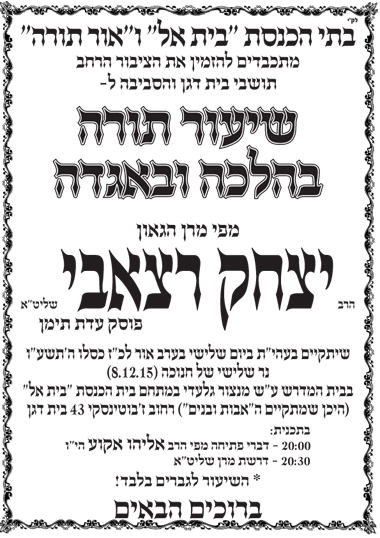 על פי הוראת מרן הגאון הרב יצחק רצאבי שליט"א וגדולי התורה והפוסקים, השימוש באינטרנט הינו לצורך בלבד, ובחיבור לאינטרנט כשר ומבוקר. כל חיבור אחר מהוה סכנה רוחנית וחינוכית.