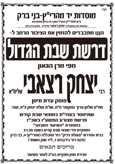על פי הוראת מרן הגאון הרב יצחק רצאבי שליט"א וגדולי התורה והפוסקים, השימוש באינטרנט הינו לצורך בלבד, ובחיבור לאינטרנט כשר ומבוקר. כל חיבור אחר מהוה סכנה רוחנית וחינוכית.