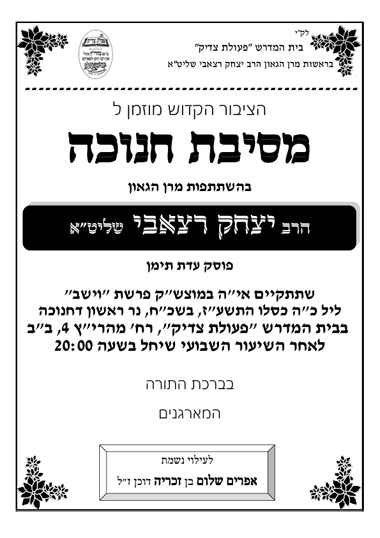 על פי הוראת מרן הגאון הרב יצחק רצאבי שליט"א וגדולי התורה והפוסקים, השימוש באינטרנט הינו לצורך בלבד, ובחיבור לאינטרנט כשר ומבוקר. כל חיבור אחר מהוה סכנה רוחנית וחינוכית.