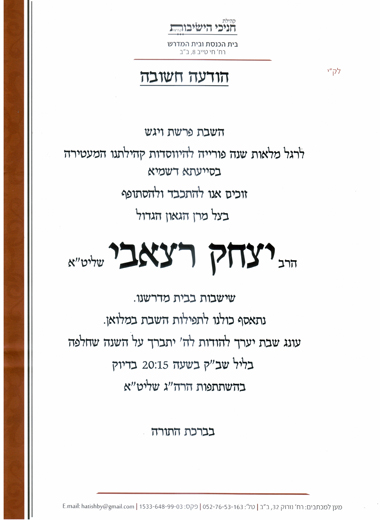 על פי הוראת מרן הגאון הרב יצחק רצאבי שליט"א וגדולי התורה והפוסקים, השימוש באינטרנט הינו לצורך בלבד, ובחיבור לאינטרנט כשר ומבוקר. כל חיבור אחר מהוה סכנה רוחנית וחינוכית.