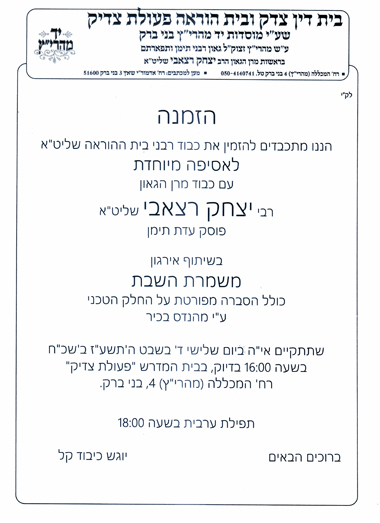 אסיפת רבני בית ההוראה "פעולת צדיק" - בשיתוף אירגון "משמרת השבת"