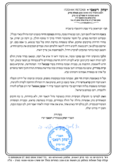 על פי הוראת מרן הגאון הרב יצחק רצאבי שליט"א וגדולי התורה והפוסקים, השימוש באינטרנט הינו לצורך בלבד, ובחיבור לאינטרנט כשר ומבוקר. כל חיבור אחר מהוה סכנה רוחנית וחינוכית.