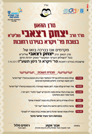 התרגשות גדולה בקרב ציבור בני התורה תושבי העיר רחובות עם בואו של מרן הגאון רבי יצחק רצאבי שליט"א - פוסק עדת תימן לשבות בעיר רחובות ת"ו בשבת קודש פרשת ויקרא ה'תשע"ז. מרן שליט"א ימסור בעז"ה שיעורי תורה בששה מקומות ברחבי העיר, מצ"ב מודעה. ברוכים הבאים!