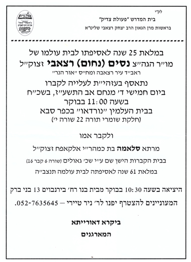 במלאות 25 שנה לאסיפתו לבית עולמו של מו"ר הגה"צ הרב נסים (נחום) רצאבי זצוק"ל ראב"ד העיר רצאבה ומח"ס "אור הנר", אביו של מרן הגר"י רצאבי שליט"א, נתאסף בעזהי"ת לעלייה לקברו ביום חמישי ד' מנחם אב ה'תשע"ז ב'שכ"ח בשעה 11:00 בבוקר בבית העלמין נורדאו - כפר סבא (חלקת שומרי תורה 22 שורה י'). וכן לקבר אמו של הגר"נ רצאבי זצ"ל, מרת סלאמה בת כמהר"י אלקאפח ע"ה, בבית הקברות הישן שם ע"י שכ' גאולים (שורה 6 קבר 16) במלאות 61 שנה לאסיפתה לבית עולמה. תנצב"ה.