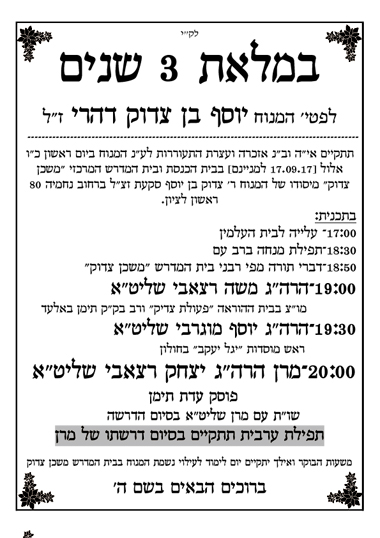 במלאות 3 שנים לפטירת המנוח ר' יוסף בן צדוק דהרי ז"ל, אביו של ידידנו היקר הרב איתי דהרי יצ"ו, תתקיים אי"ה ובל"נ אזכרה ועצרת התעוררות בהשתתפות מרן הגאון רבי יצחק רצאבי שליט"א, ביום ראשון כ"ו אלול התשע"ז (17.9.17 למניינם) בבית הכנסת ובית המדרש "משכן צדוק" מיסודו של המנוח ר' צדוק בן יוסף סקעת זצ"ל, רחוב נחמיה 80 שיכון המזרח - ראשון לציון. מצ"ב התכנית. תהא נשמת המנוח צרורה בצרור החיים, אכי"ר.